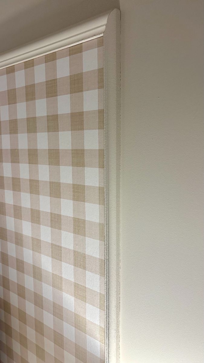 Creative use of panel moulding to frame a checkered pattern for unique panelling behind a bed.